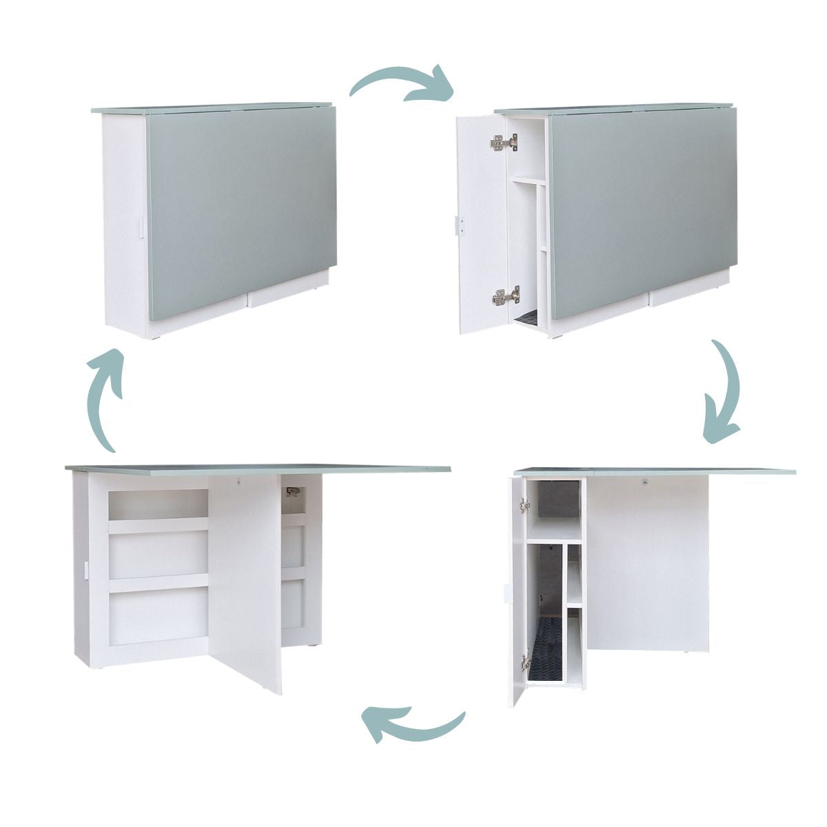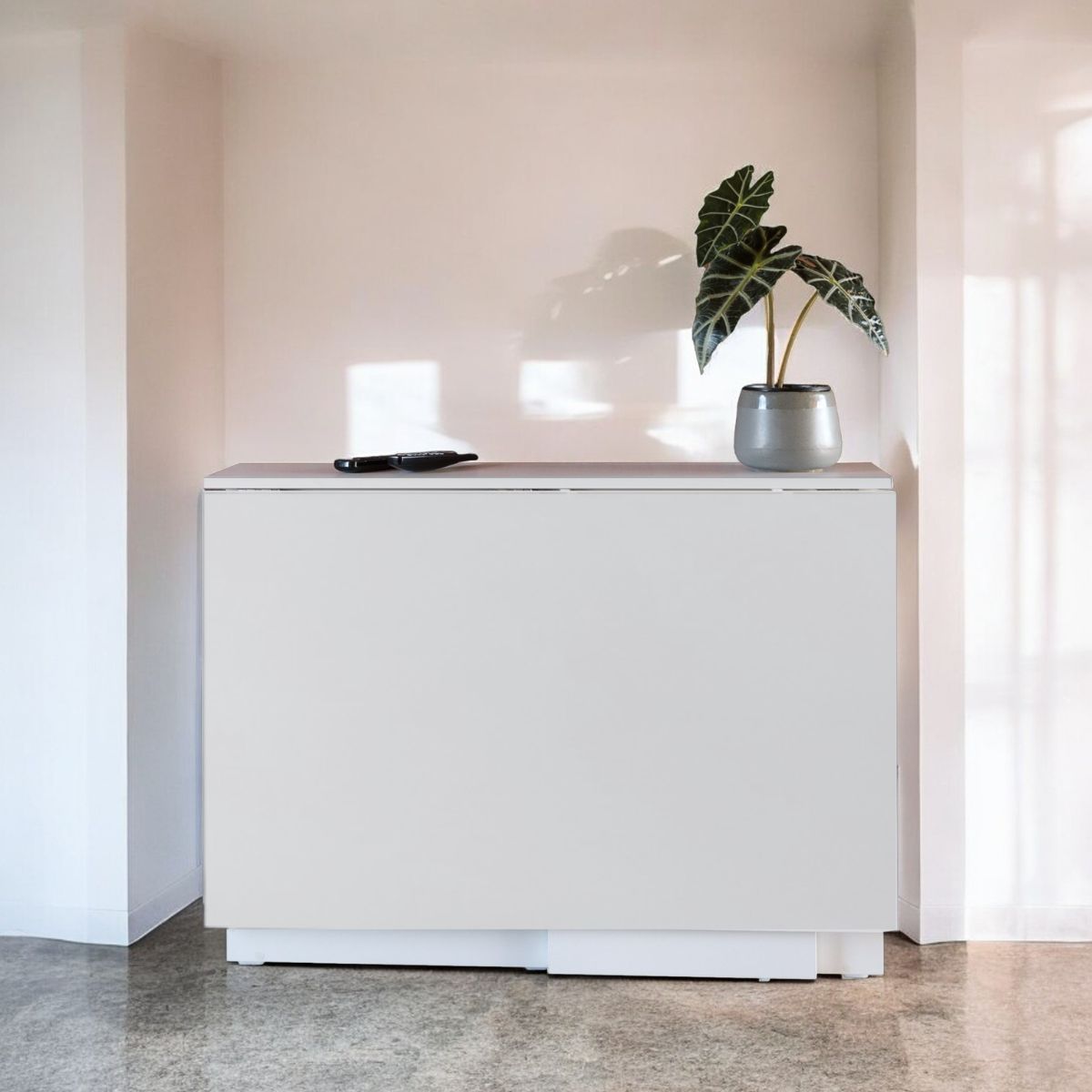 The SpaceSave Folding Console Storage Table adapts to your lifestyle — transforming in seconds from a sleek console to a full dining table or workstation with space to store 2 chairs inside.